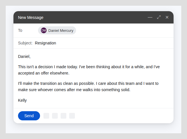 Jessica heard through Slack. Someone in Sales mentioned it casually, the way people mention earthquakes they didn't feel. "Heads up, Kelly's leaving."