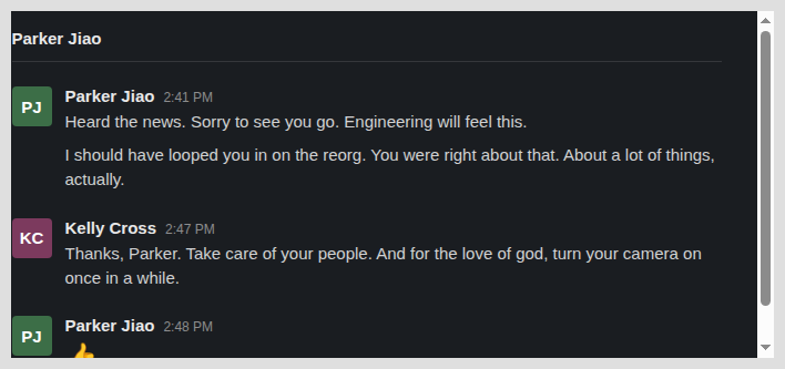 Parker sent a Slack message. Of course he did.