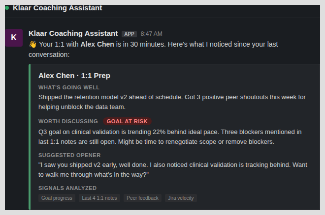 That's the part that mattered. Managers weren't going to open Claude and run a workflow before every 1:1. They needed the insight to come to them, proactively, in the place where they already work.
